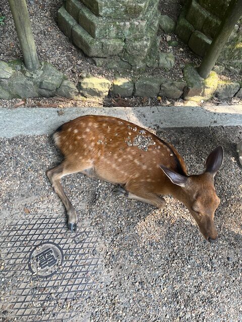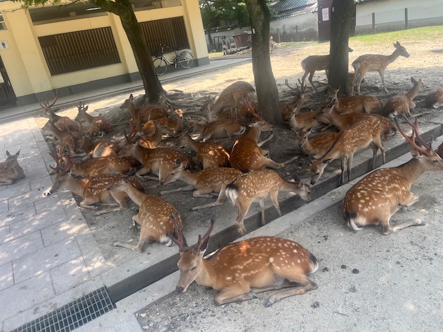 日陰で鹿せんべいを持った修学旅行中の高校生が案の定大量の鹿に囲まれて、結構な声量で助けを求めていたこと、見るからに汚ったねえ緑がかったの池に鹿が入ってゆったり涼んでいたりとかかな。奈良なら日常なのかもしれない。